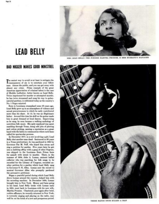 Leadbelly was “discovered” by the Lomaxes when they recorded singers at Angola State Prison in Louisiana in 1933 (see image above). John Lomax petitioned the governor of Louisiana to have him released early, and took him on tour around the U.S. In 1937, Life magazine published an article about him entitled: “Lead Belly: Bad N*gger Makes Good Minstrel.”